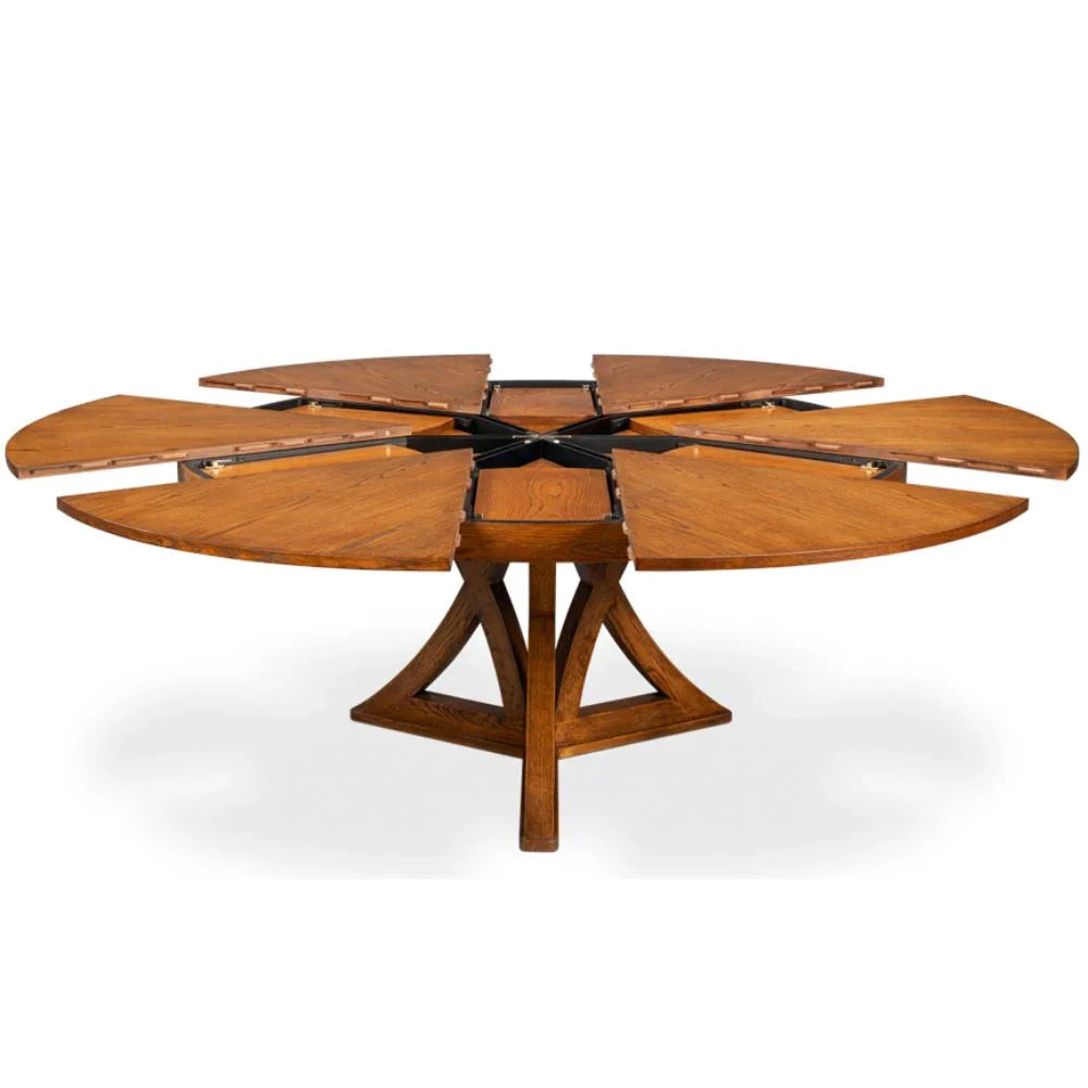 Découvrez le charme de la table à manger Jupe couleur vison, une pièce d'une grande finesse qui invite à la détente. Son pied central associe chêne clair et fer texturé pour un style unique, à la fois naturel et industriel. Le plateau rond est orné de placages savamment agencés qui mettent en valeur le grain naturel du bois, le tout sublimé par une riche teinte brun vison. Et pour accueillir vos invités, la table s'agrandit facilement.