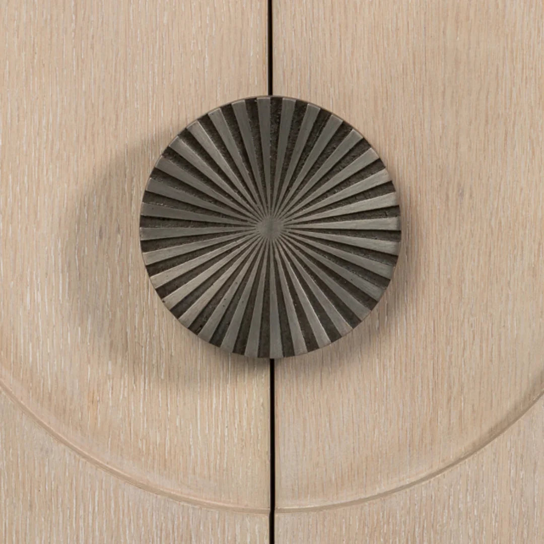 Ce buffet remarquable allie une élégance intemporelle à une sensibilité moderne grâce à sa chaleureuse structure en placage de chêne et à ses portes sculptées originales. Les ferrures en bronze s'inspirent des lignes fluides des cloches de carillon, ajoutant une touche artistique inattendue qui élève ce meuble au-delà de sa simple fonction. Son design soigné harmonise sophistication et charme accessible, en faisant une pièce maîtresse idéale pour les salons, les salles à manger ou les bureaux à domicile en quête de style et de fonctionnalité.