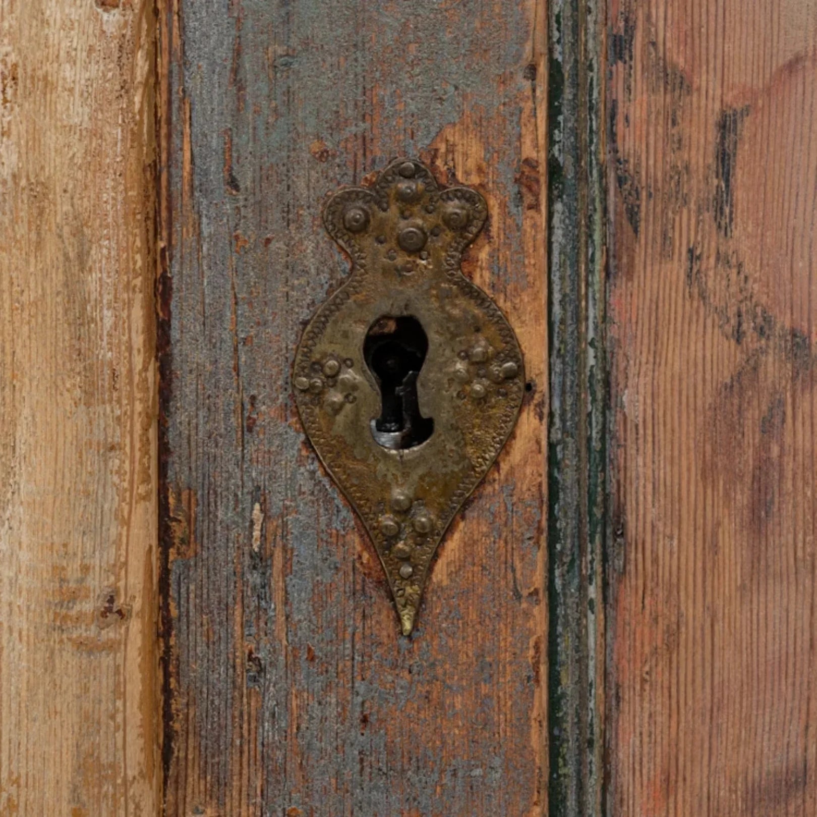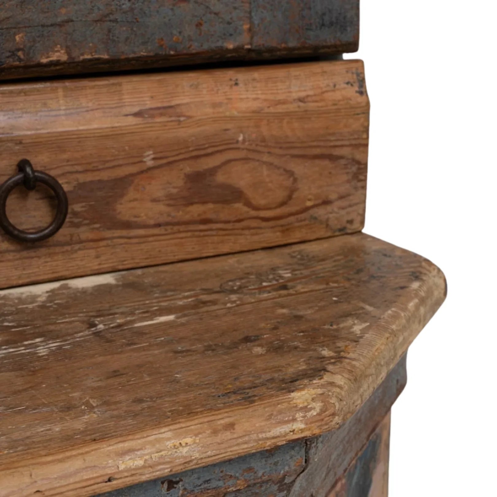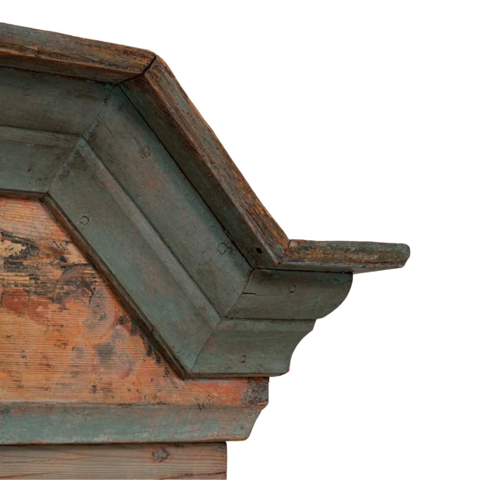 Un meuble unique en bois massif, d'inspiration suédoise du XIXe siècle et de style français classique. Ses boiseries et étagères intérieures, peintes en vert, ainsi que ses motifs floraux peints à la main sur le plateau arqué et les portes, évoquent la douceur d'un été. Deux étagères supérieures, deux tiroirs et deux étagères inférieures offrent un espace de rangement généreux.