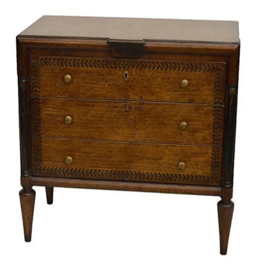 Cette charmante commode vénitienne à décor de feuilles gravées est confectionnée en bois chaleureux et ornée d'élégantes incrustations pour un style raffiné. Dotée de trois tiroirs pratiques et d'une conception compacte, elle est idéale pour les petits espaces, que ce soit comme table de chevet ou comme meuble d'entrée élégant.