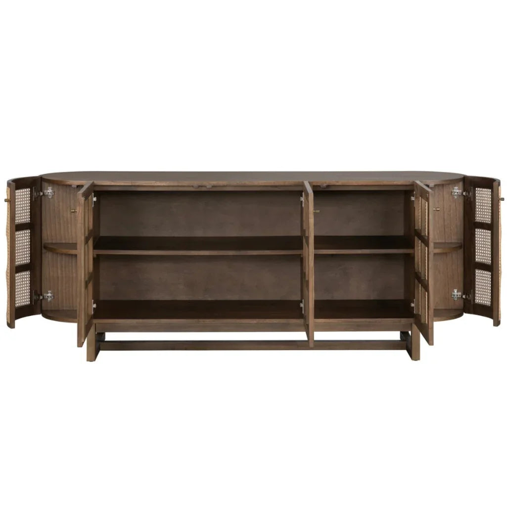 Le buffet à portes en rotin tressé aux lignes arrondies allie design contemporain et charme naturel pour une ambiance chaleureuse. Ses bords incurvés lui confèrent une touche de douceur, rehaussée par des portes finement tressées qui soulignent son caractère unique. Offrant un espace de rangement généreux, ce meuble élégant et fonctionnel est idéal pour sublimer votre salle à manger, votre salon ou votre entrée.